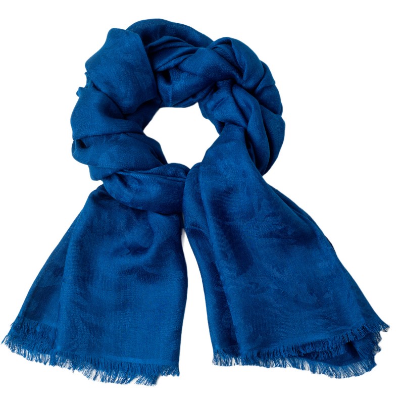 Blåt jacquard vævet sjal i cashmere/silke. 200 x 70 cm.
