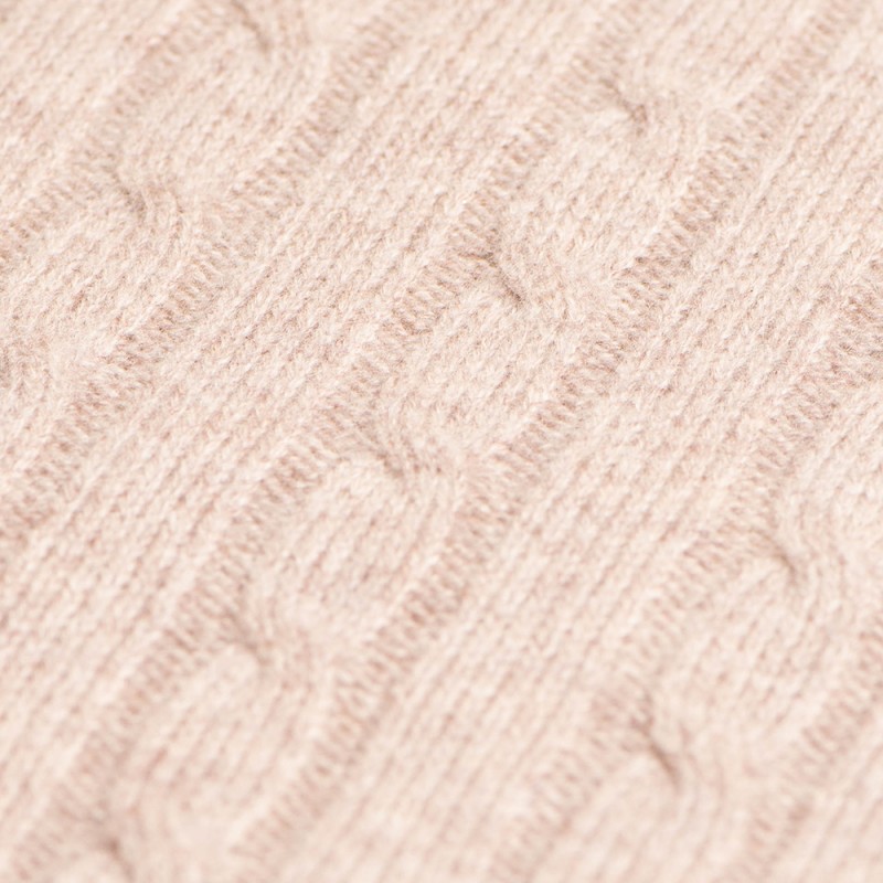 Stort cashmere tæppe i beige kabelstrik. Tæppet måler 200 x 180 cm.
