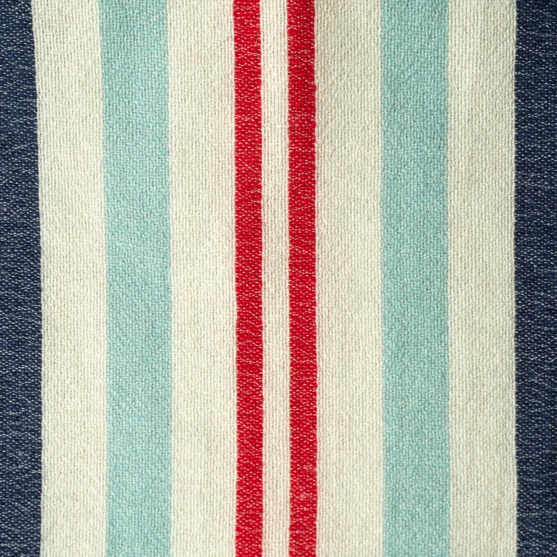 Oversize tørklæde i råhvid med blå og røde striber. Tørklædet er håndvævet i 50% cashmere/50% fin uld og måler 200 x 90 cm.
