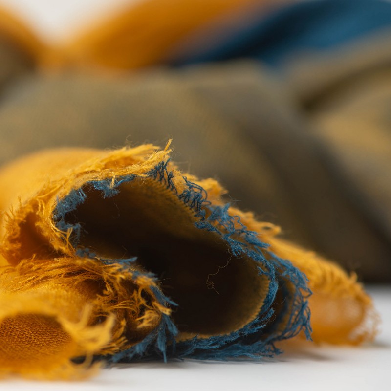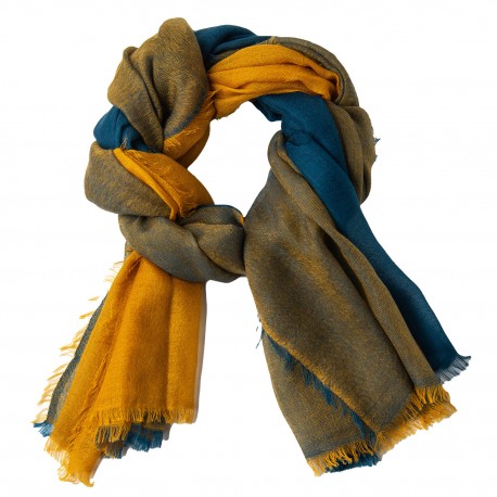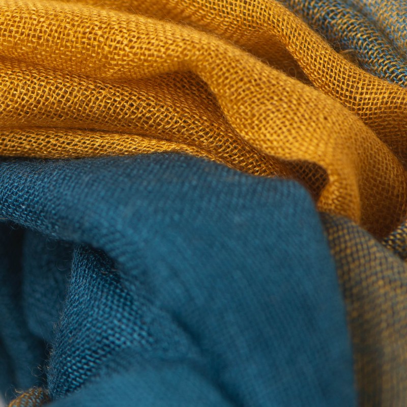 Elegant ternet cashmeresjal i smukke nuancer af gul og blå. Dette lette og luftige tørklæde er omhyggeligt håndvævet af vores dygtige vævere i Kathmandu. Med en størrelse på 200 x 100 cm og fine naturlige frynser i enderne er det både stilfuldt og komfortabelt.