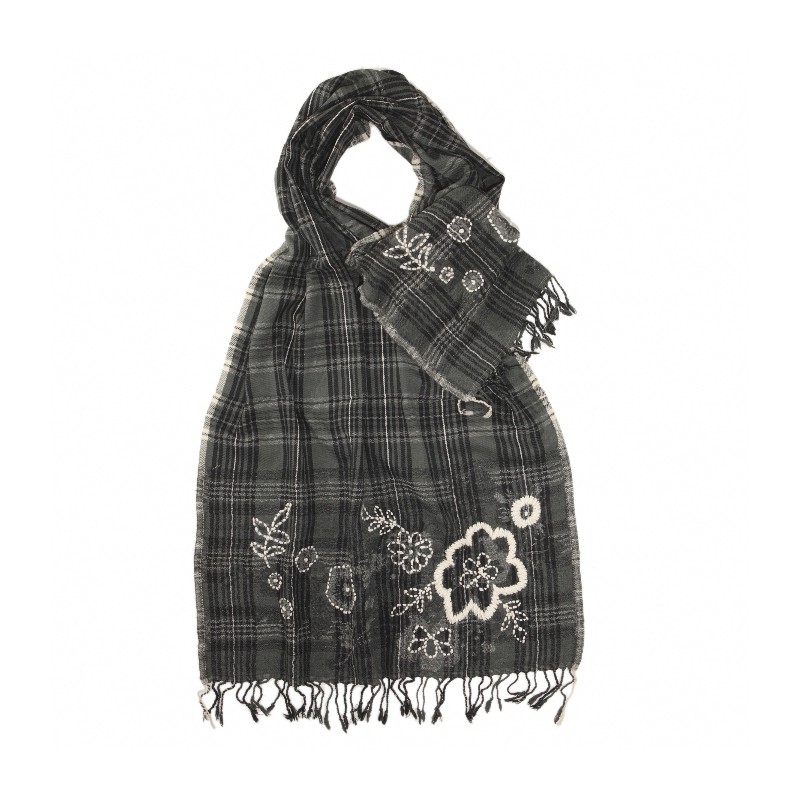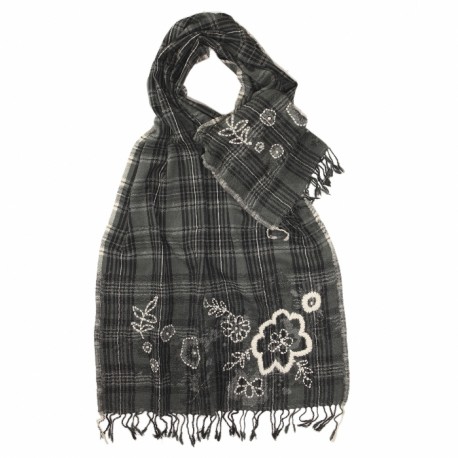 Gråt uldtørklæde med blomsterbroderi.